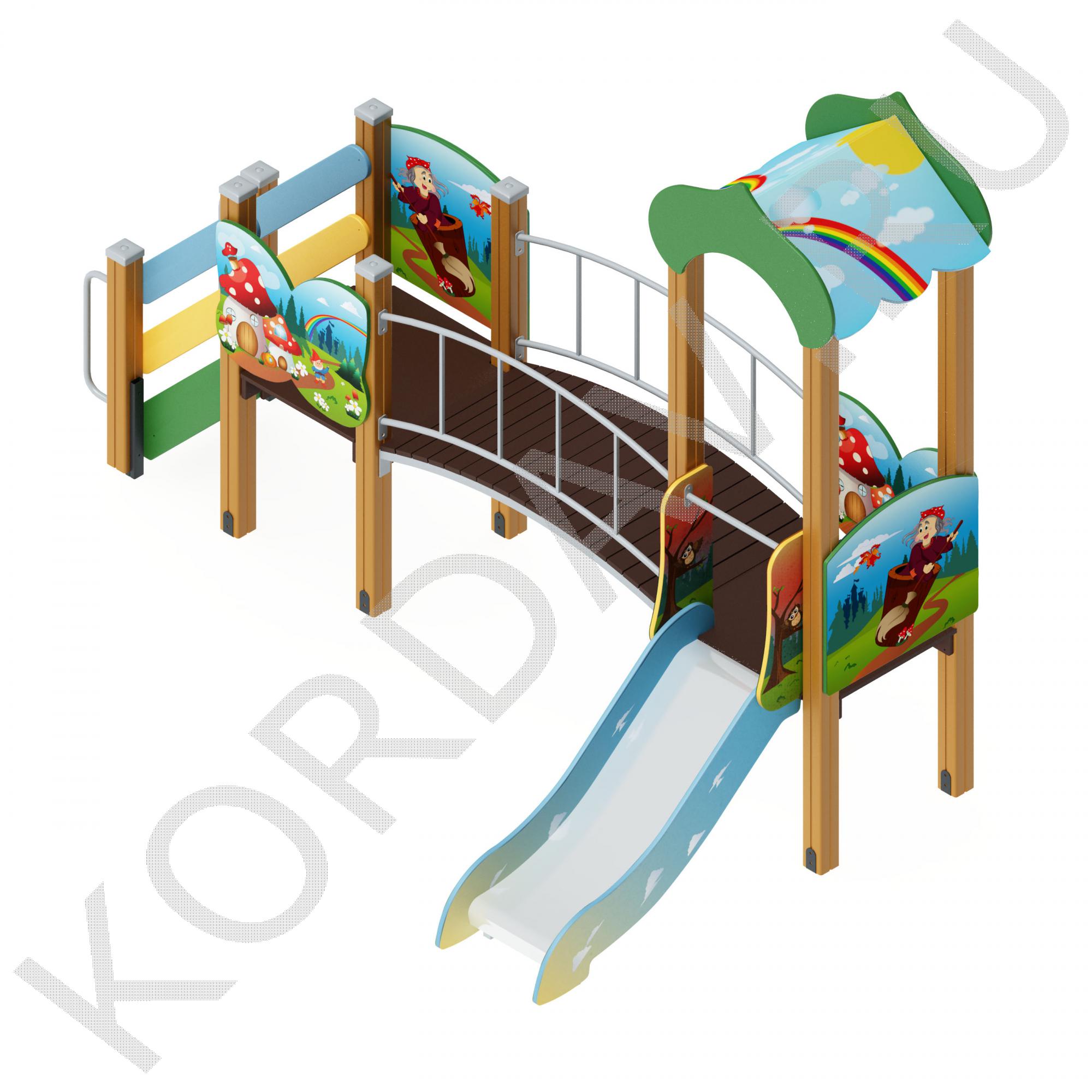 Комплекс ПДИ 1.17 для игр детей 3-7 лет состоит из: двух башен, маленькой лестницы, горки, четыре ограждения для башен, дугообразный мост и ограждение для моста. Металлические элементы имеют закругленную форму, все швы тщательно обработаны. Все стальные детали окрашены порошковой краской, стойкой к коррозии и атмосферным осадкам, а закладные части покрыты двумя слоями краски. Деревянные части ПДИ 1.17, подверженные воздействию осадков покрыты полиуретановой краской, на остальные изделия из фанеры нанесена акриловая водно-дисперсная краска. Большая башня высотой 2,5 м имеет двухскатную крышу и ограждения из влагостойкой фанеры. Для декора использованы стилизованные арки. Малая башня, как и большая состоит из 4-х оснований из клеёных брусьев 100*100 мм. Полы в башнях устланы ламинированной древесной плиты, с нанесенным антискользащим покрытием. Мини лестница изготовлена из фанеры толщиной 18 мм с ламинированным покрытием, а бортики из влагостойкой 27 мм. Для скат-горки использована нержавеющего листа сталь толщиной 1,5 мм шириной 540 мм. Для безопасности по краям есть 30 мм бортики, для опорного каркаса горки взят профиль 40*25 и трубы 32 диаметром. Дугообразный каркас моста состоит из сварной стальной трубы диаметром 32 и полосы 40*4 мм. Дуга с плавным радиусом окрашена в синий цвет. Протяженность моста 1,5 м, а его ширина 0,8 м. Ограждение является парной сварной конструкцией с плавным радиусом, окрашенной в красный цвет.