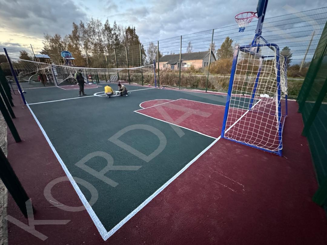 Совмещённые детская и спортивная площадки. Использовано оборудование: